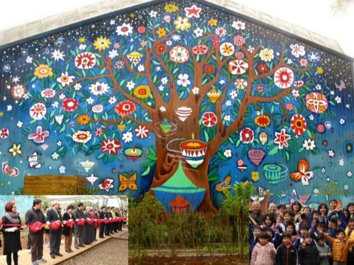 Mr. Wu, who has dedicated his life to the development of the gyro sport, is also a passionate educator. His creativity has turned the gyro sport into performance art. Under his gentle but firm coaching, Mei Hwa students become confident and self-assured through long hours of individual and team practices. His effort led to the building of the Gyro Top Museum, where local culture is preserved, honored, and celebrated. Our mural is titled the Mei Hwa Gyro Tree of Life in recognition of this culture.